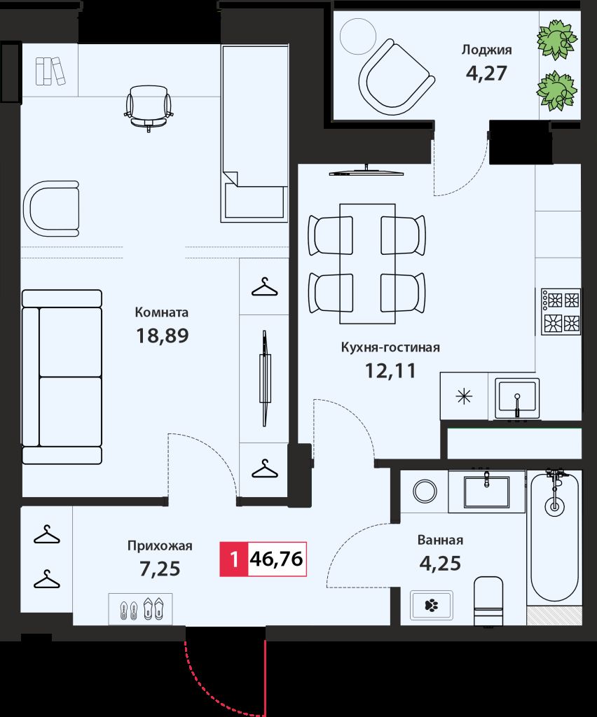 | Площадь (кв.м.) | Общая: 46.76 Жилая: 18.89 Кухня: 12.11 46.76 / 18.89 / 12.11 |