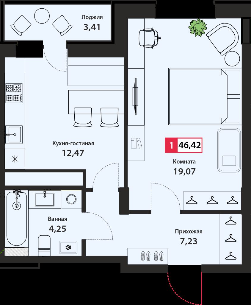 | Площадь (кв.м.) | Общая: 46.42 Жилая: 19.07 Кухня: 12.17 46.42 / 19.07 / 12.17 |